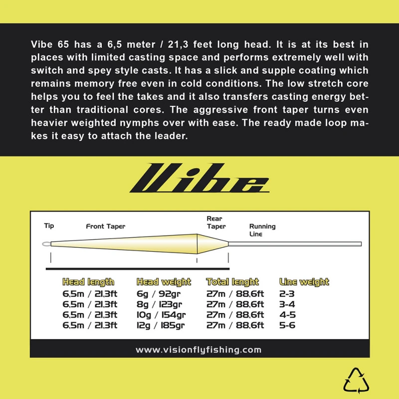 La ligne à mouche Vibe 65 a une tête de 6,5 mètres de long. Elle est à son meilleur dans les endroits où l’espace de lancer est très limité et se comporte extrêmement bien avec les lancers de type switch et spey. Elle possède un revêtement lisse et souple qui reste sans mémoire même dans des conditions froides. L’effilage frontal agressif permet de retourner facilement les nymphes les plus lourdes. La boucle prête à l’emploi permet d’attacher facilement le bas de ligne. Sans phtalate.Tête de 6,5 mètres de longIdéale dans les endroits où l’espace de lancer est très limitéTrès performant pour les lancers de type « switch » et « spey ».Revêtement lisse et soupleSans mémoire même dans des conditions froidesCône avant agressifBoucle prête à l’emploiSans phtalate